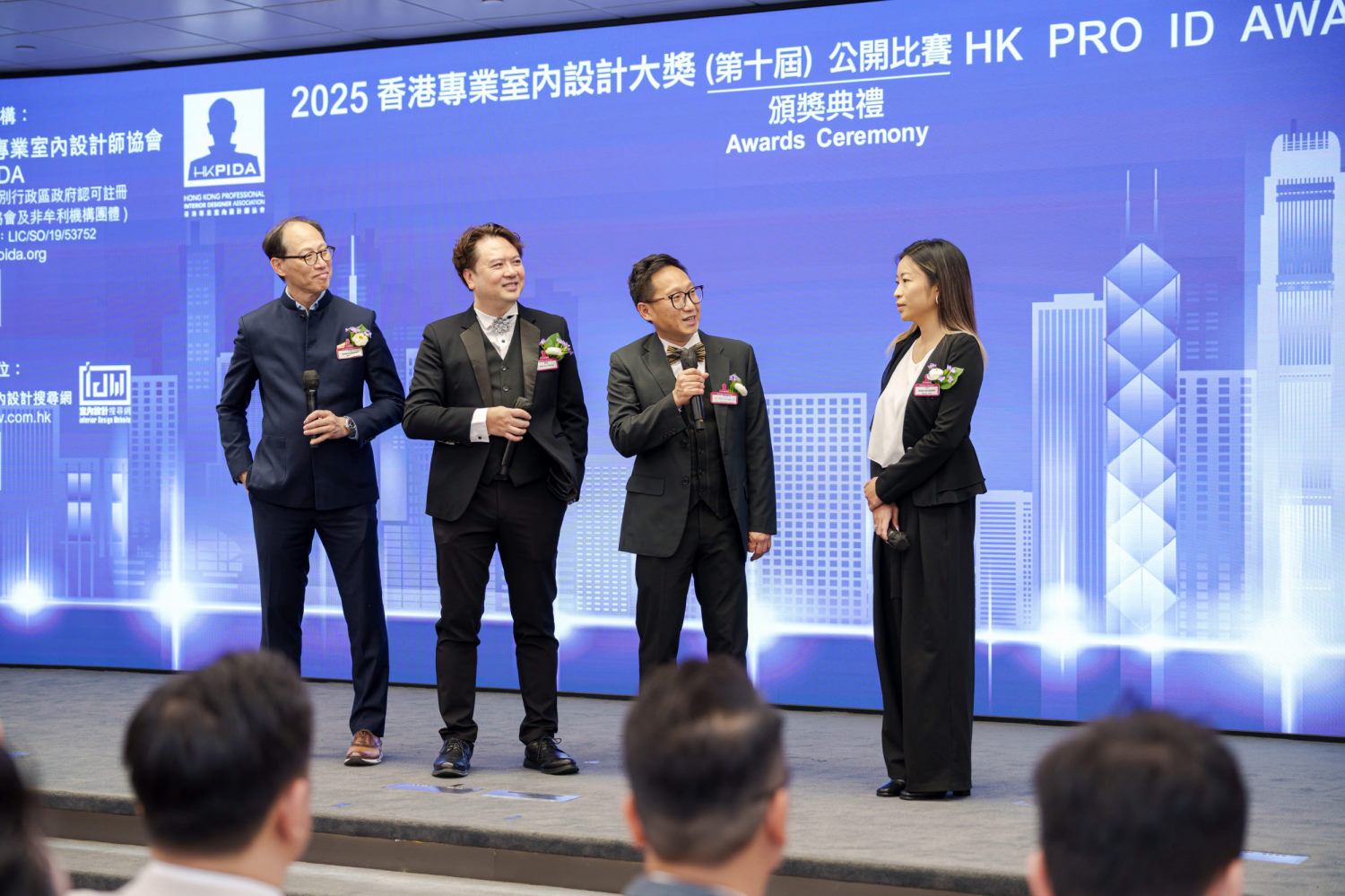 業界專業評審團上台分享評審細節及重點: 包括:會長Alex Au Yeung、副會長Stephen Yuen、香港傢俬裝飾廠商總會-主席Allen Kwong、香港室內設計建築學院-校長Sammi Yuen
