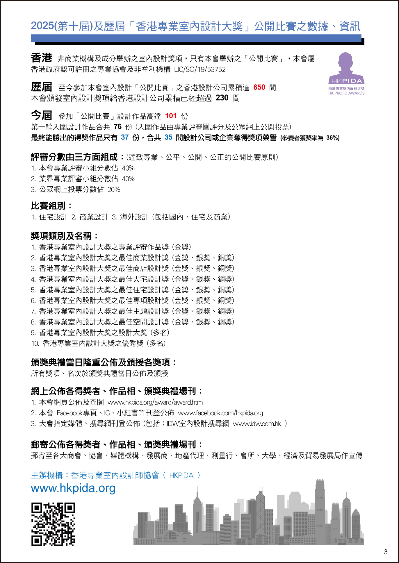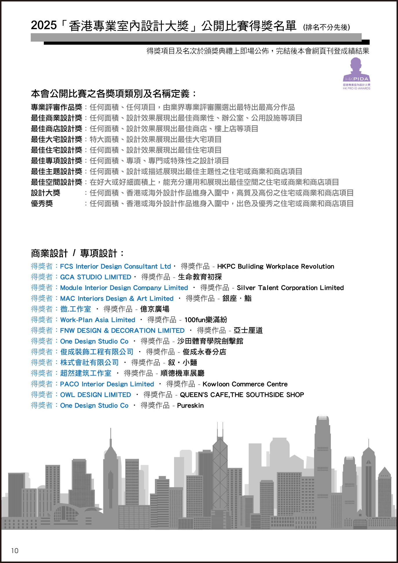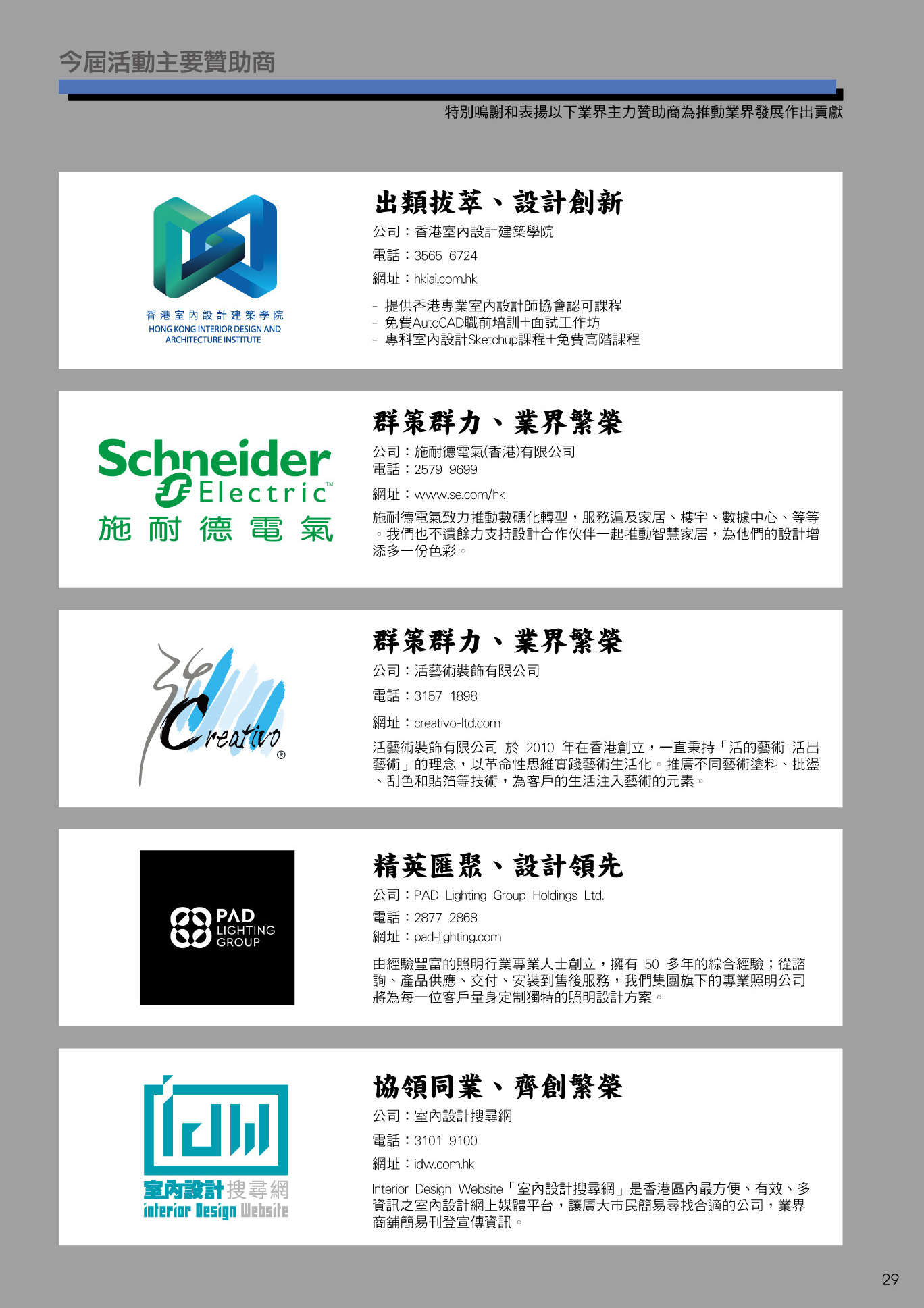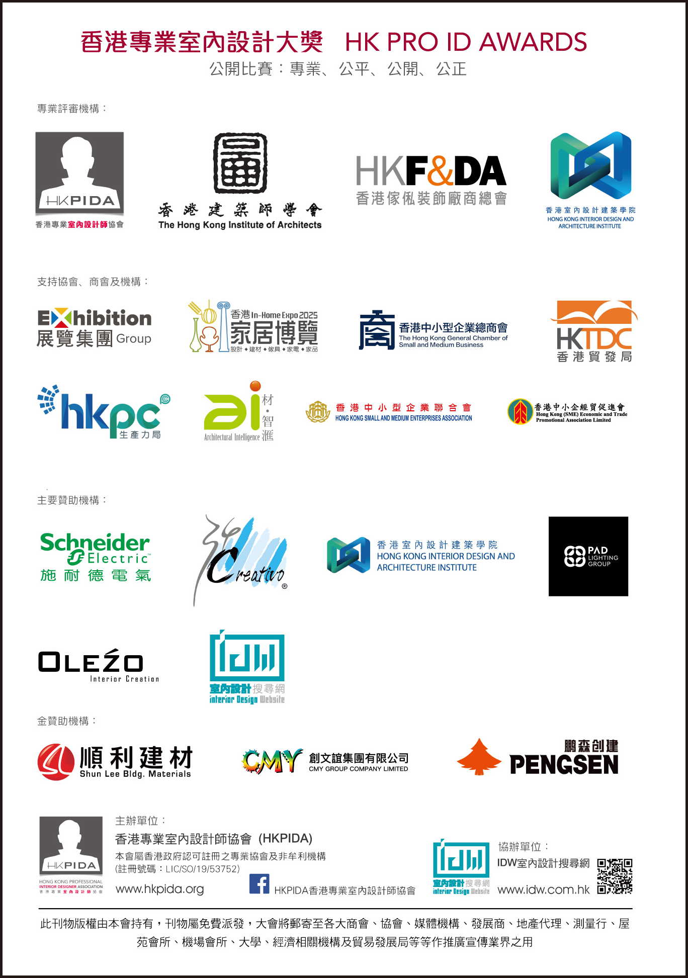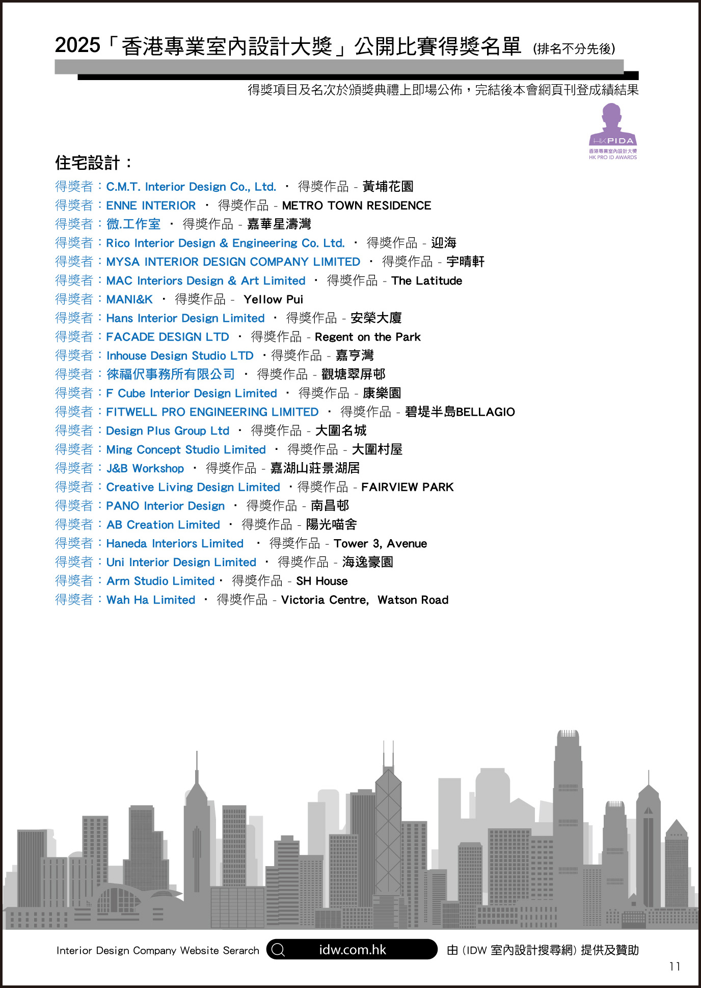 HKPIDA 香港專業室內設計師協會,每年專為香港室內設計師及公司舉辦一個公眾認受性、代表性的公開設計比賽及頒獎典禮,當日盛會場面非常鼎盛、頒授37個室內設計獎項,參與活動連嘉賓及贊助商合共超過二百多人出席這次盛會,見證各得獎者獲得榮譽一刻。 頒獎嘉賓:本會會長Alex Au Yeung、副會長Stephen Yuen、「香港傢俬裝飾廠商總會HKF&DA」主席Allen Kwong & May Leung、「香港室內設計建築學院HKIAI」校長Sammi Yuen、 特別名謝今次活動之主要贊助商為業界貢獻:Schneider Electric施耐德電氣 、PAD Lighting Group Holdings Ltd 、活藝術裝飾有限公司 、HKIAI香港室內設計建築學院 、IDW室內設計搜尋網 支持活動之企業及會員: 請按以下查詢