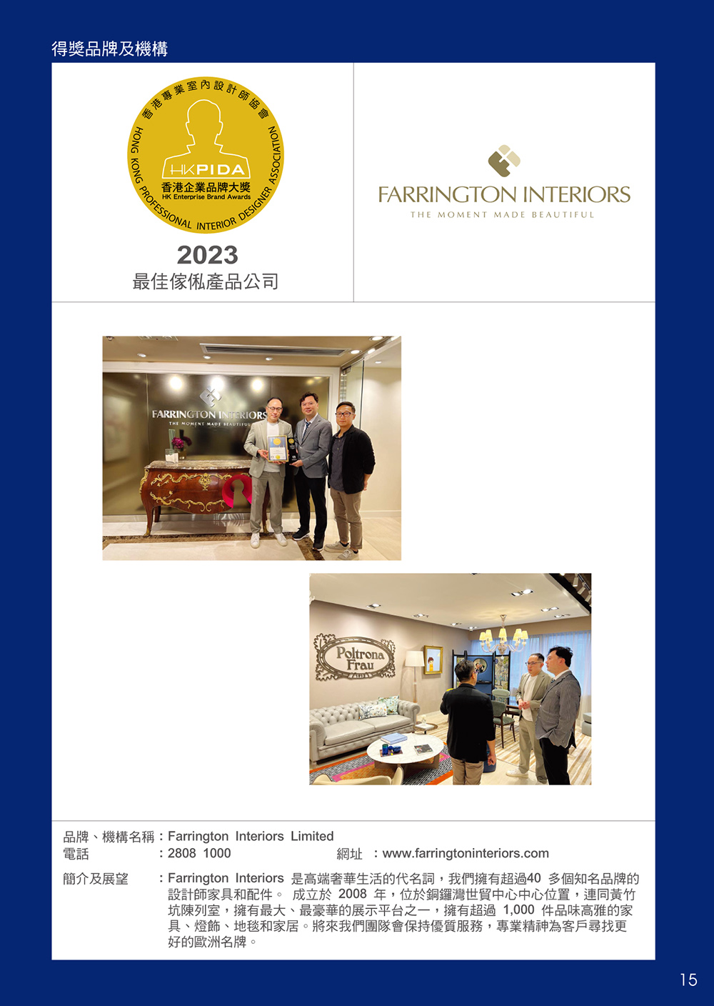 HKPIDA 香港專業室內設計師協會每年舉辦全屬於香港及業界「香港企業品牌大獎」獎項活動,本會為達致企業品牌大獎之真正意義和體驗,故此本會會長帶領各委員親身參觀各得獎企業,並頒授獎項榮譽給得獎公司,每間得獎企業亦專承為本會展示及介紹其公司產品和專業服務,讓我們更了解得獎企業會員之業務,可向有需要有關產品和服務的本會會員及業界朋友推廣出去,所以此獎項除加許得獎者外更達到有效之公司宣傳效果。