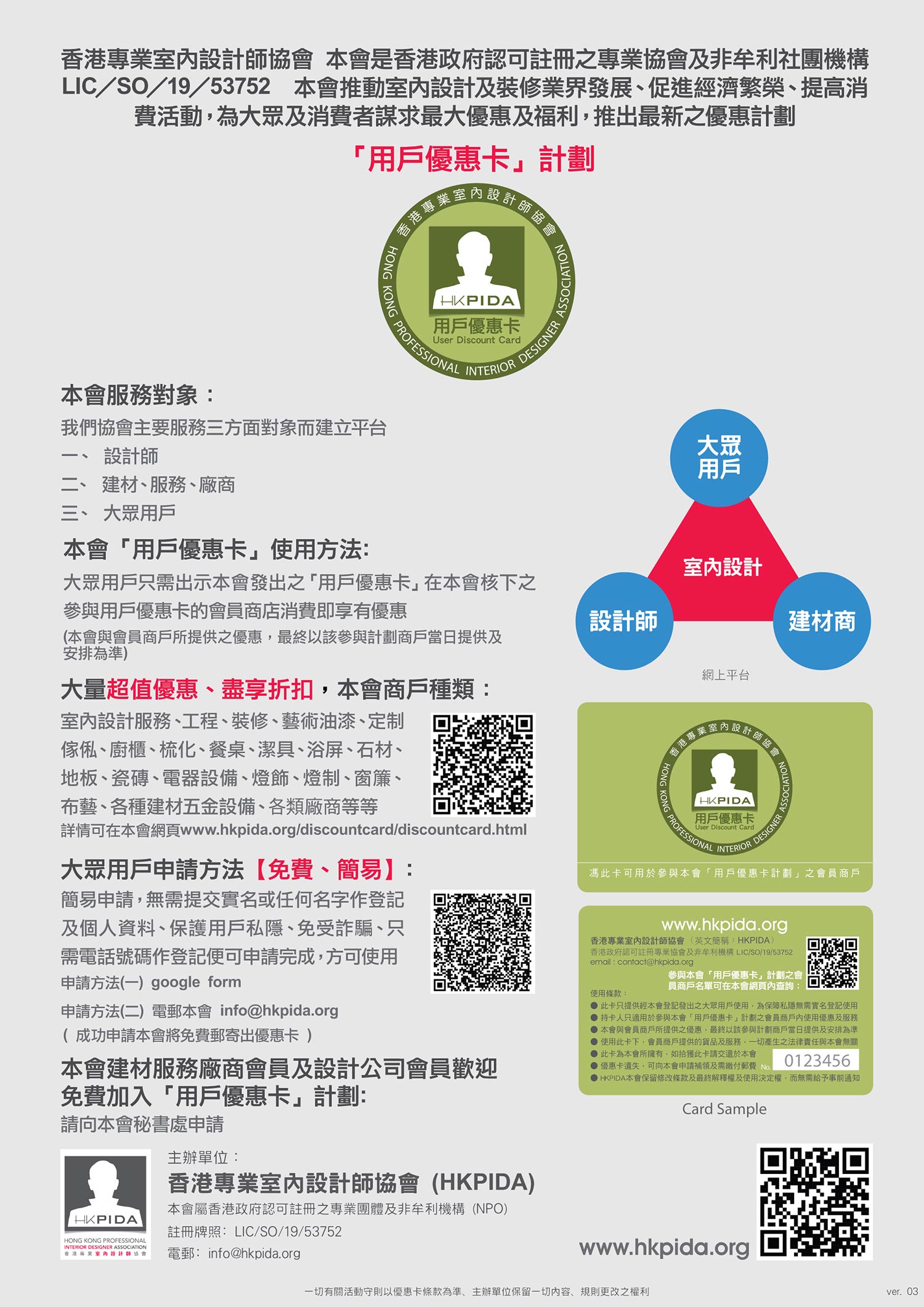 包括:室內設計、工程、建材公司、產品公司、業界專業服務公司、傢俬公司、訂製傢俬廠等等 ( 顧客用戶可於貼有本會優惠卡標籤商戶使用)