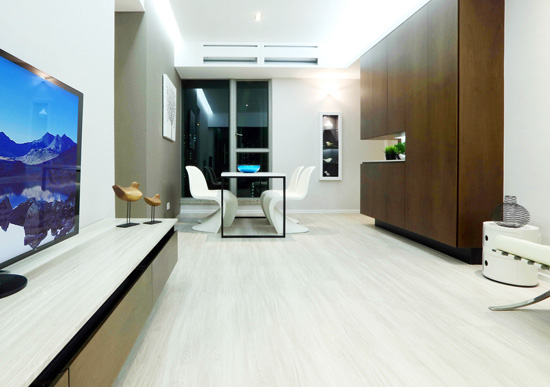真木地板以外的選擇 一個室內設計想營造溫馨或暖意風格,木材及木地板原素是不可決少的,但天然木材往往最大問題是會出展爆裂、彎曲變形、遇水發黑、蟲蛀等問題,但近年科技及環保技術帶領下,Floover生產一種仿天然木紋的膠質長條木地板,它的像真度及觸感度達95%相似,它的厚度由2mm至9mm不等,適合不同環境及設計使用,當然此材料完全沒有真木材地板的問題發生,客戶可安心使用。